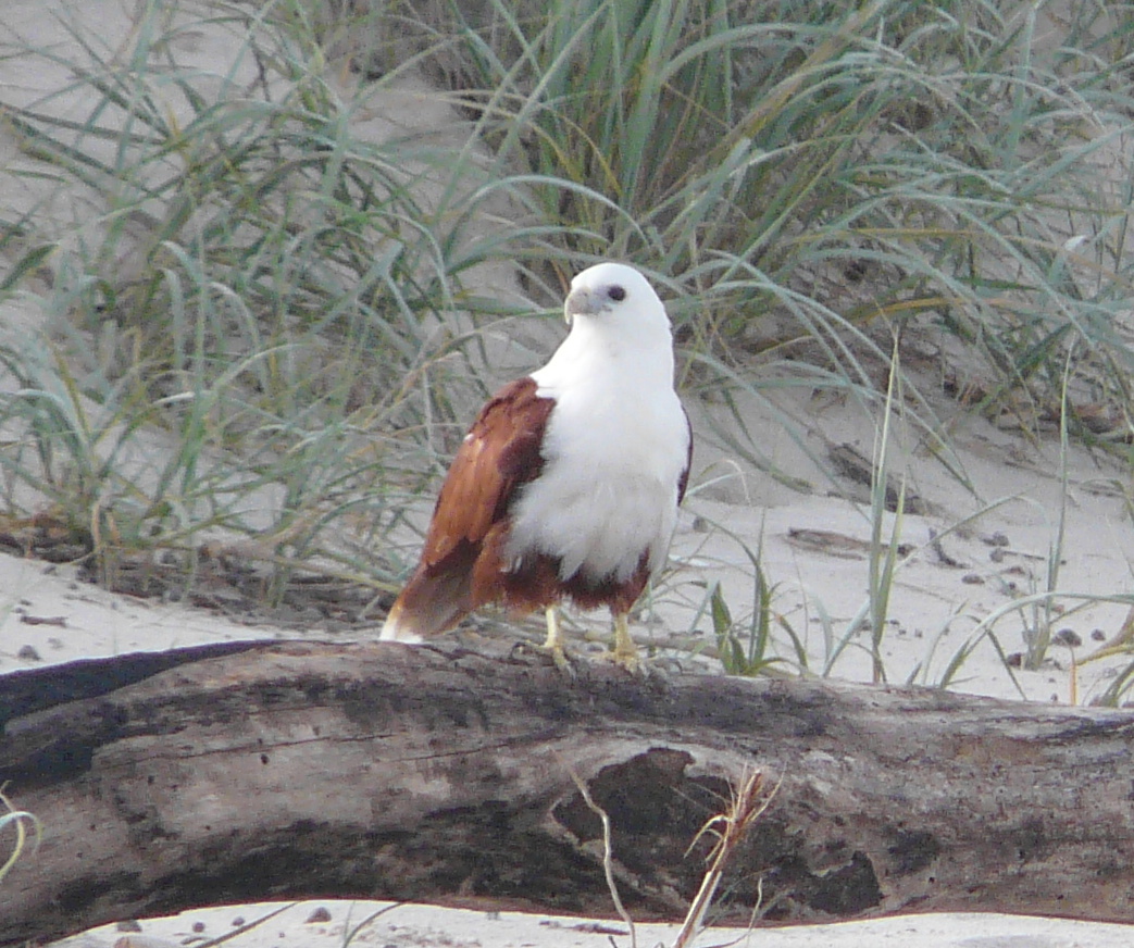 A bit further on I came to a clearing in the bush and trees between me and the beach. There was only very low ground cover and one dead tree reaching bony fingers to the sky about forty metres away. On these bare branches there were two eagles perched close together.