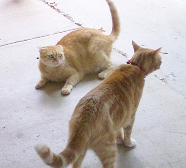 He does the dominant male thing and she does the submissive but defiant female thing, flat to the ground, ears back and hissing at him. It’s a bit comical to watch, though they take it very seriously. Just like people.