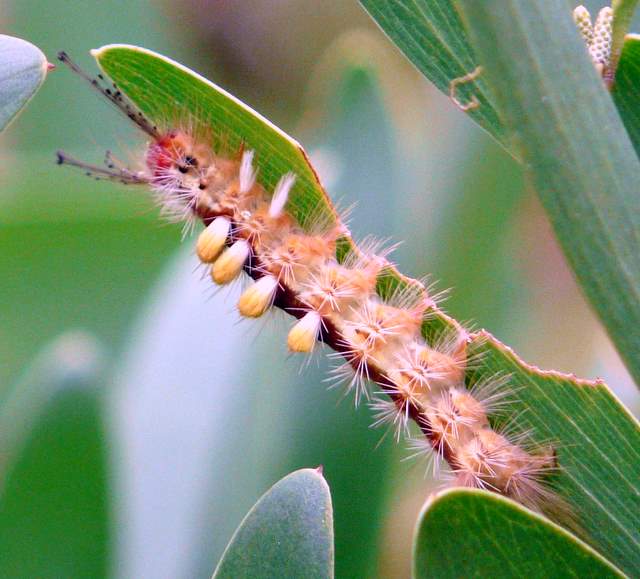 On the way home I stopped by one of my favourite bushes and a caterpillar caught my eye. It’s a colourful thing with some tufts and what looks like antennae at one end, and spiny bristles set in bundles all along its length. I didn’t know what to make of all the bits and bobs, it was a bit confusing which end was which and what did what. It looked dangerous in fact. Probably the birds feel the same way and just leave it alone, better safe than sorry.