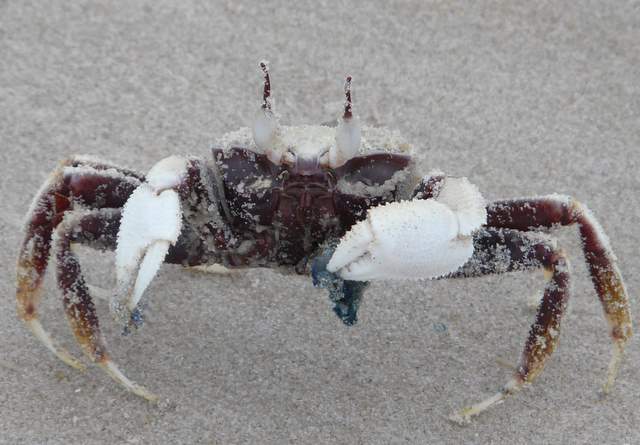These crabs live in holes in the sand at the edge of the sea. Twice a day they remake their homes with the passing of the tides. Twice a day they dig their way out of the sand to find food, and at least twice a day they dig themselves into the sand for shelter from the dangers of living in an existence where life is divided into many different forms. And one form lives off another.