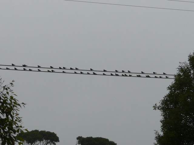 Gently raining, small drops. Wind blowing a little. And all the Swallows parked on the wire, or is it Swift’s. It must be a pleasure for them or why not find shelter, there may be a good reason. Maybe their wings are not suited to maneuvering among the branches. They do build mud nests after all. In accessible, to them, places.