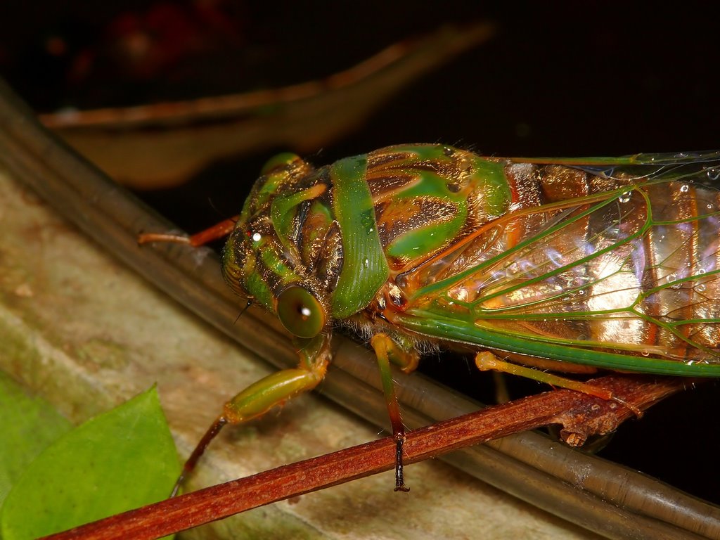 I was out looking at the sky and things, stars, insects around the light, frogs at the water tank. One of the frogs favourite places is a little water bowl by the old tank. I was looking into it to see if there is any mosquito larva in the water when I heard a buzzing of wings rapidly approaching from behind. Then plop, into the water bowl a huge green cicada flies.