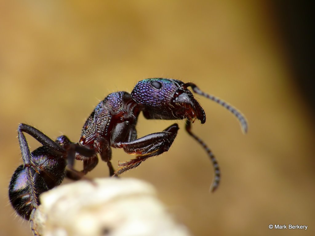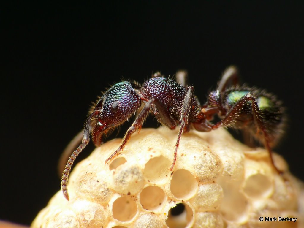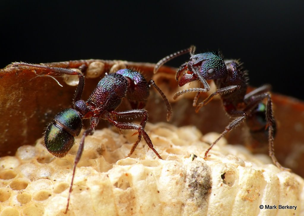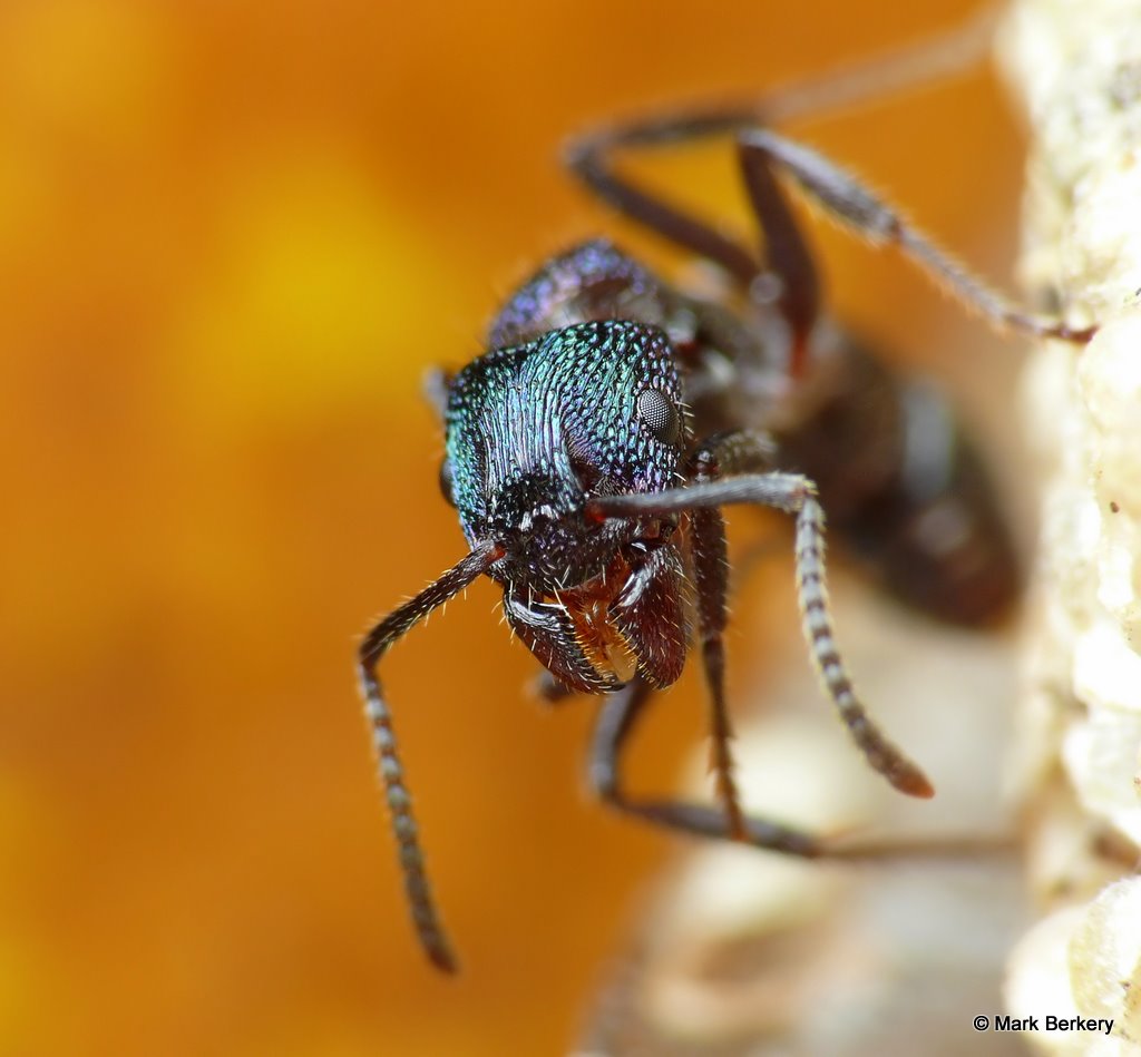 Then there are the quiet blue – green ants. There are two nests that I know of in the back garden. I have seen them many times but until recently they have been very elusive to the camera. They don’t normally eat fruit like the others and they live in the ground at the base of the fence. When they come out it is usually to find the source of disturbance, which is usually me lately, since they are on the sunny side where I shoot flies in the afternoon.