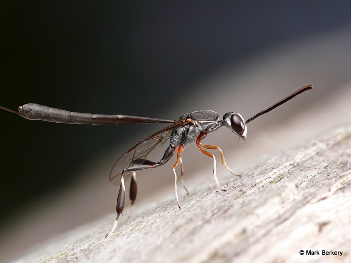 The sun was high and warm with just the ants and this beautiful silver Ichneumon Wasp on the stump, and me, standing there. The wasp was hovering and touching the wood without landing until she found what she was looking for.