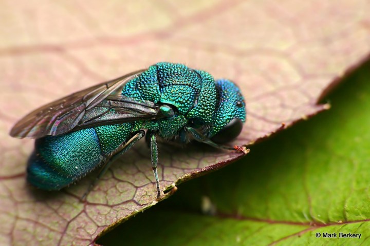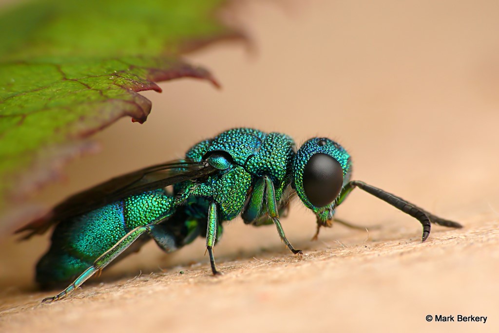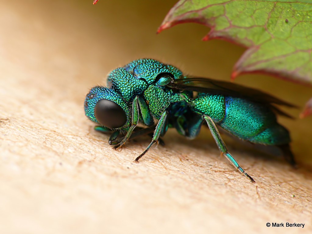 Sadly, this beautiful little Cuckoo wasp takes out bees and wasps by laying eggs in a bee/wasp nest. The eggs hatch and the larvae the eat the eggs of the bees/wasps