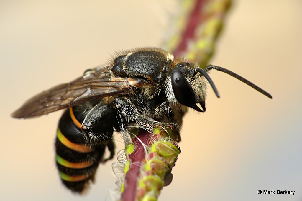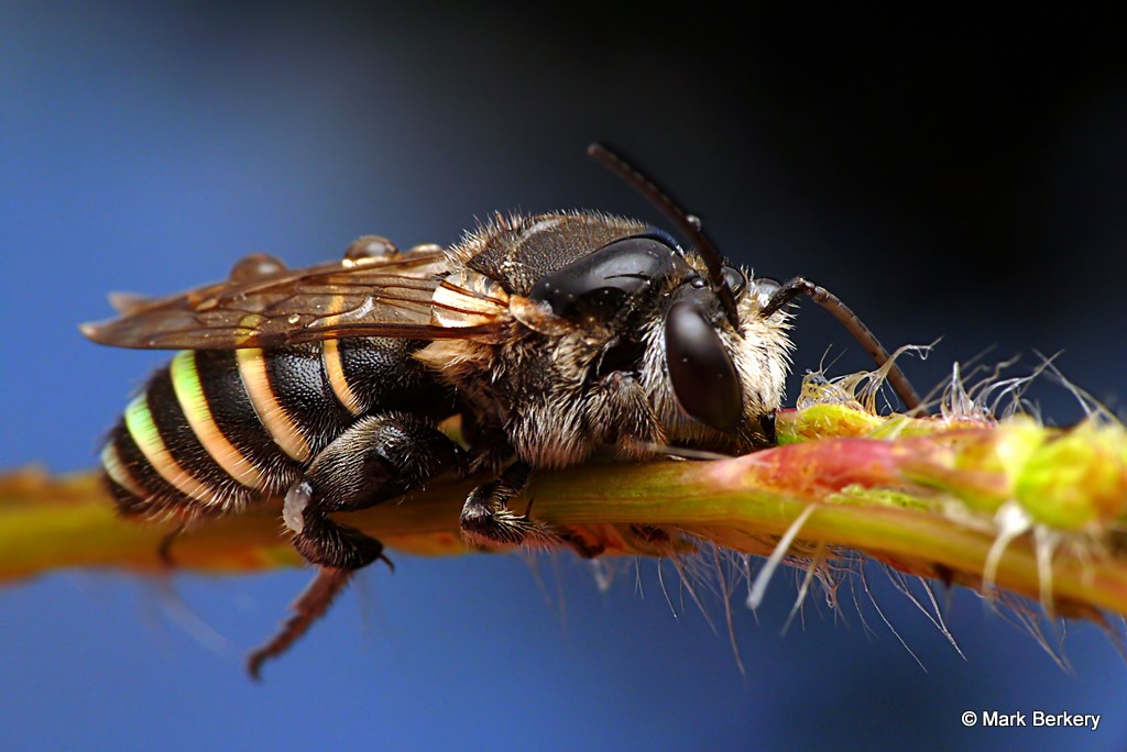 A nomad bee from a nearby field at sundown on a cloudy afternoon.