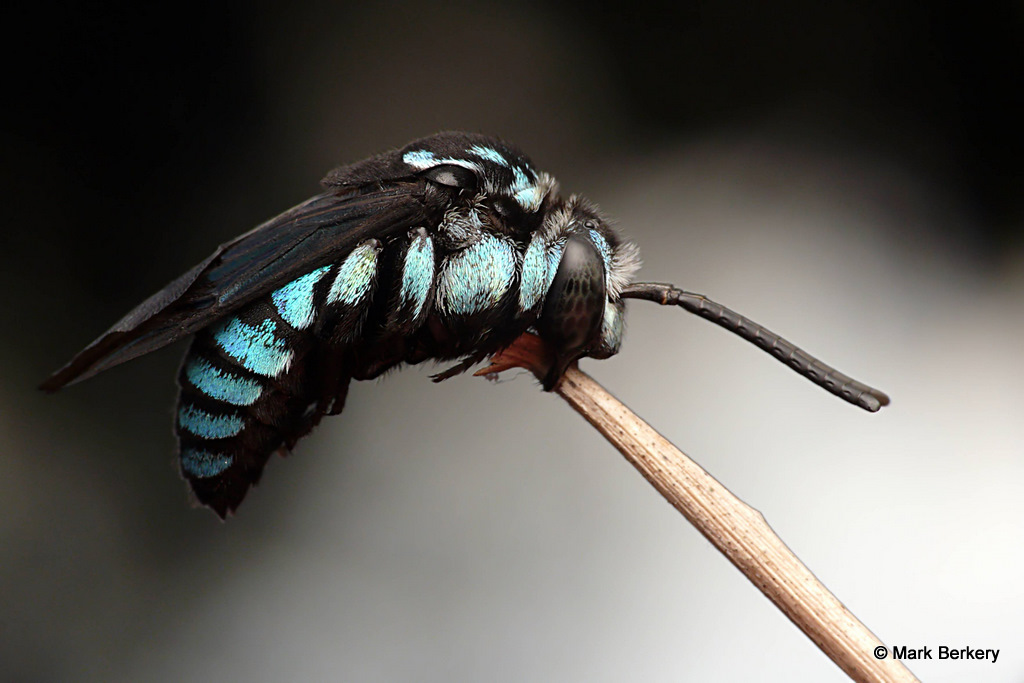 Again at dusk, the same day, I went back to the spot and there she was. As I got closer I saw the first Blue Banded Bee of this season and it was buzzing the Neon Cuckoo Bee, literally. The BBB flew up to the face of the NCB and the little dark beauty took no notice. The BBB did this a few times before flying off to its own roost, an indication of their relationship no doubt.