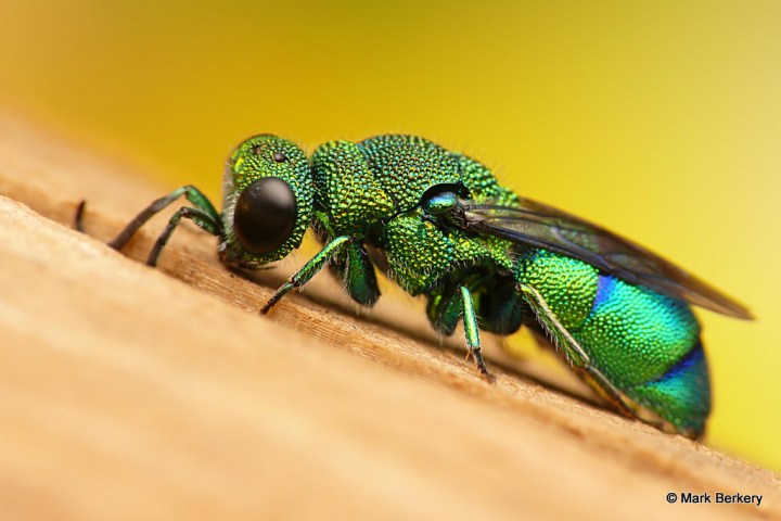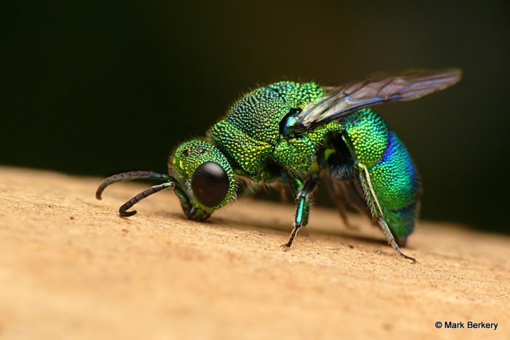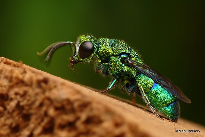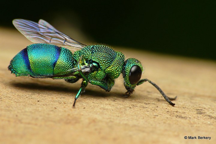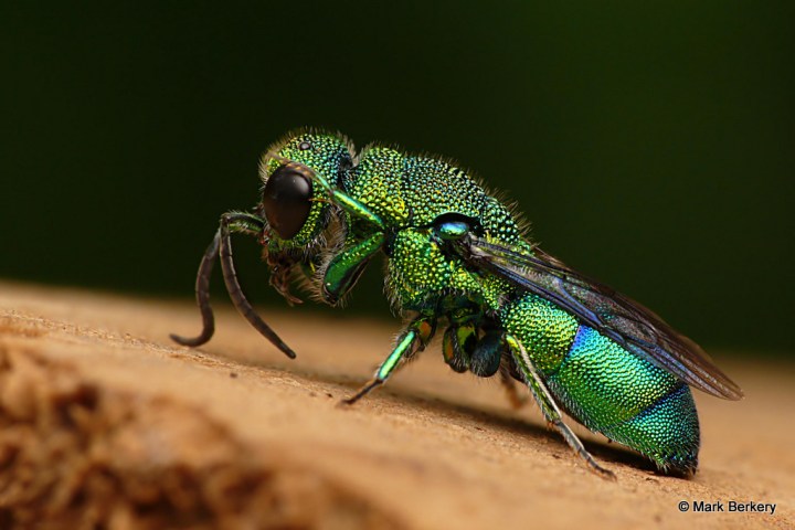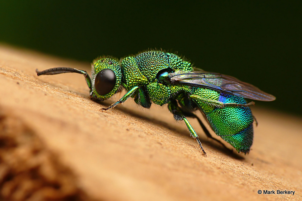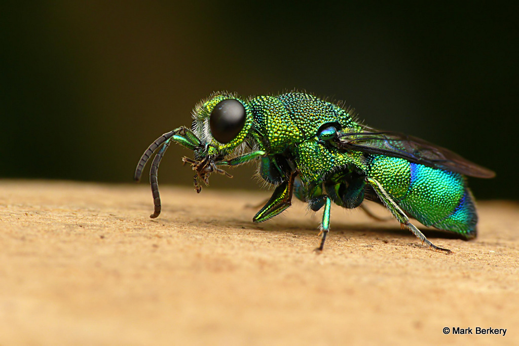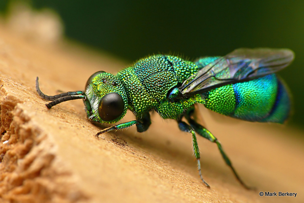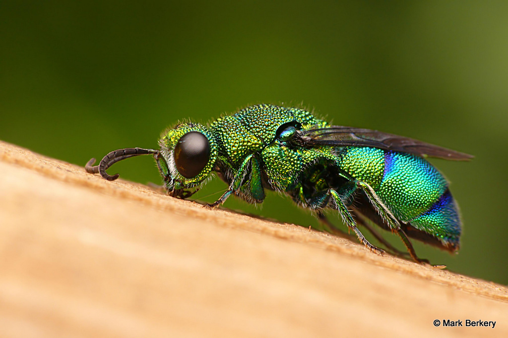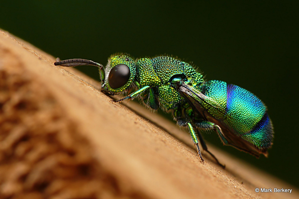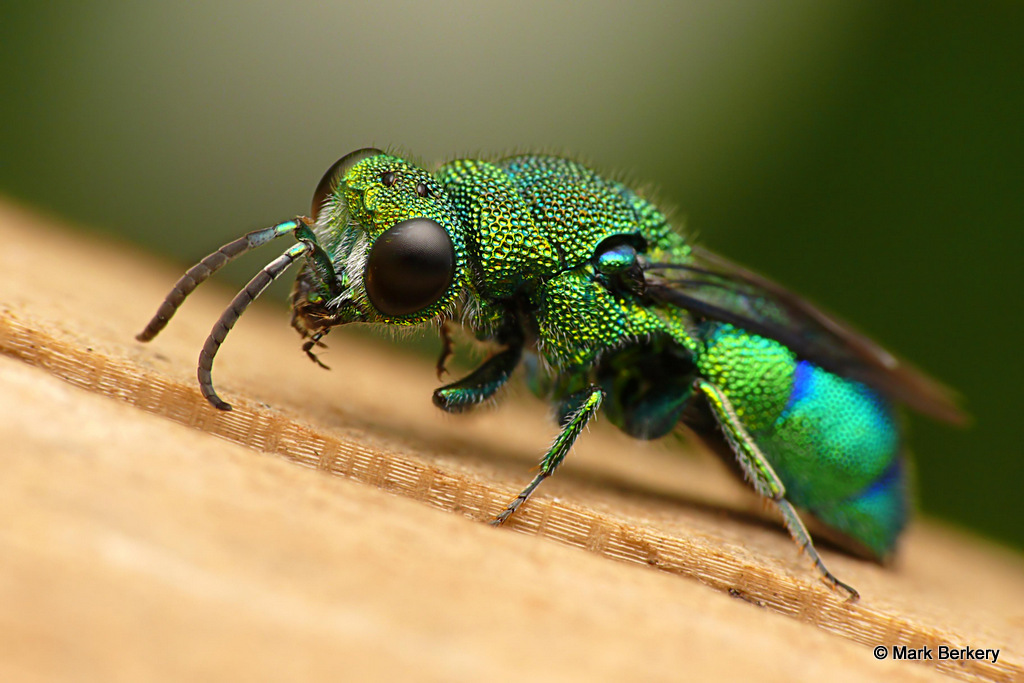 Well, I have seen one of these Emerald Cuckoo Wasps before. It was asleep, here – Neon Blue Delight – But this one was wide awake and lively after being rescued from the water. I put it on a post of rounded wood and it went about its business of drying out, cleaning off and warming up.