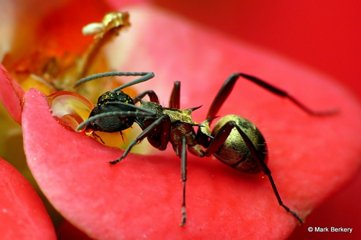 Then a little while later a Golden Spiny Ant came along, about twice as long as the bee – you can see from the size relative to the drop of honey, it’s the same drop. And it was enraptured, wouldn’t you be? Honey, the rarest of foods for free at the most opportune time, breakfast, heaven indeed.