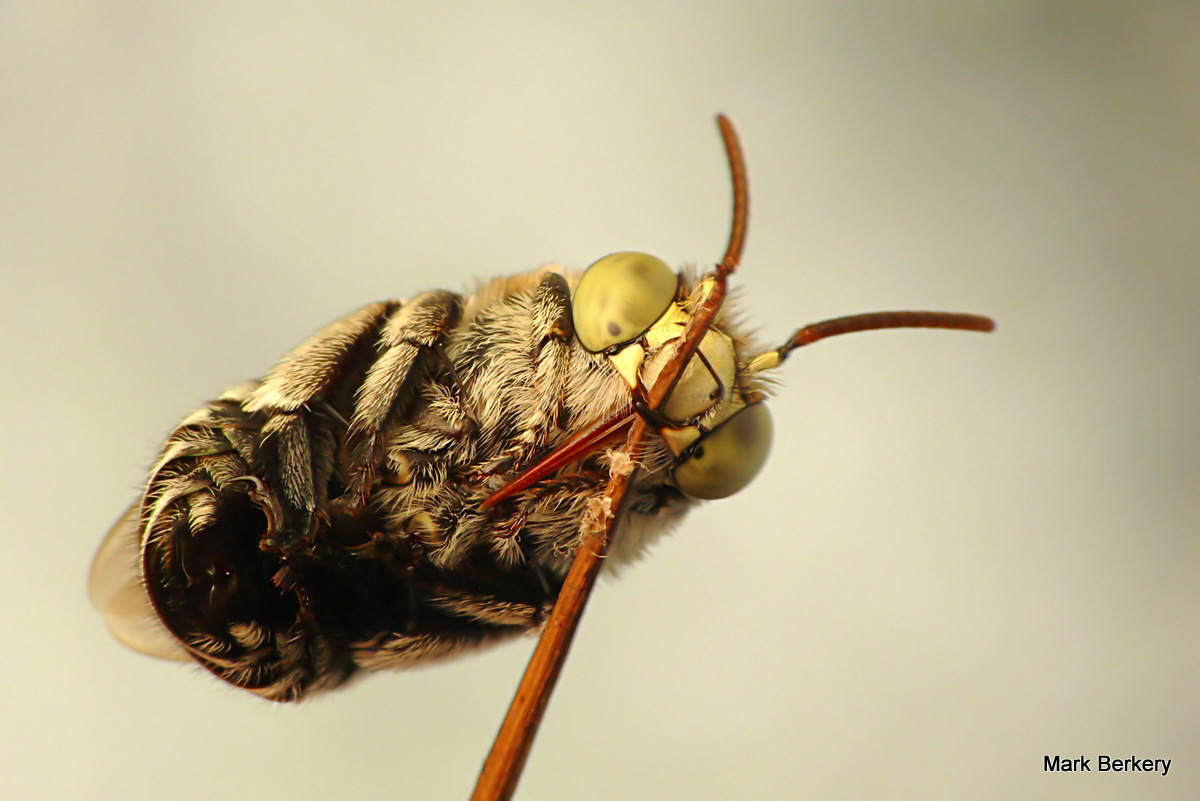 I have since noticed there is a gang of male Blue Banded Bees that roost in the back garden, up against the fence, on the dried out stems of Star Jasmine – the same the small native wasps like to hang their nests from. Also, while clearing up I disturbed a Carpenter Bee that had made its home in a dried out stick I used to support plants. When I noticed it flying around the spot the stick used to be I put the stick back, today the Carpenter is also back.