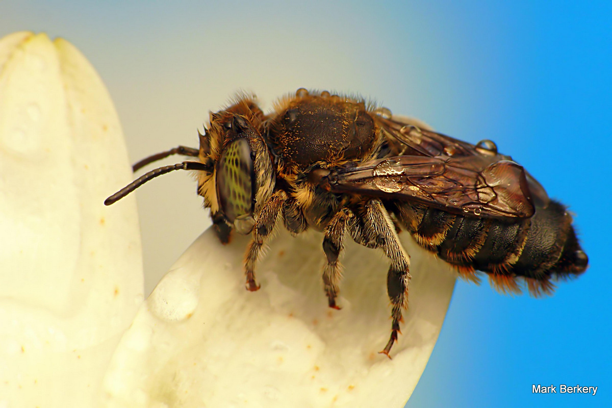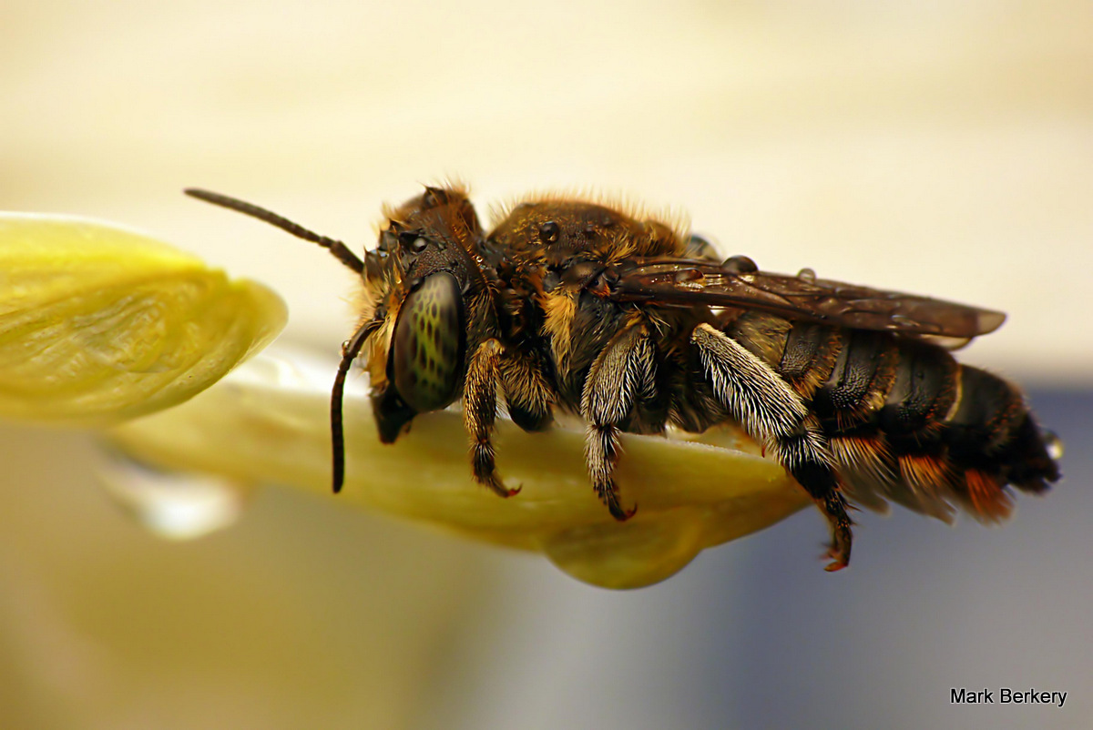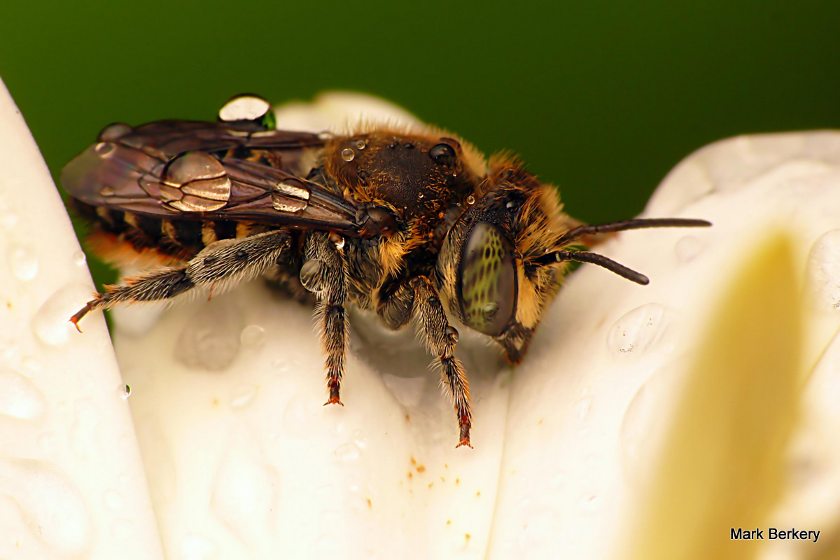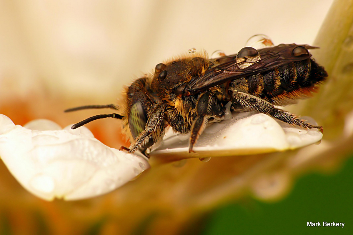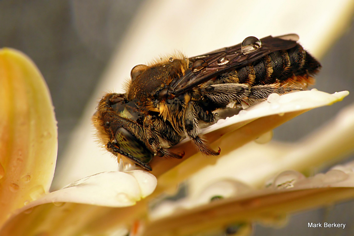 The next day she was still there so I took the flower and placed it in a glass with some water supported by thick dry tissue, to keep her from falling in the water. Then I fed her another tiny amount of honey, and she loved it. Immediately she was full of life and crawling about the new arrangement until she finally settled in the folds of the tissue where the water would be soaked off her body and she might warm up a little. Later I went out to see if I could get another shot and she was gone with the lull in the weather. Today, two days later, a similar bee, looking very healthy, landed on a nearby leaf as I was walking the garden – maybe her. Who is to know such a thing?