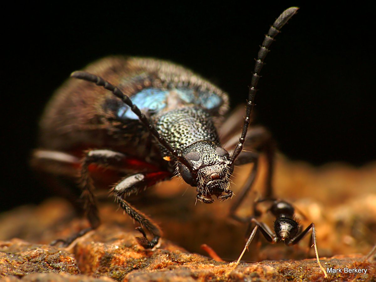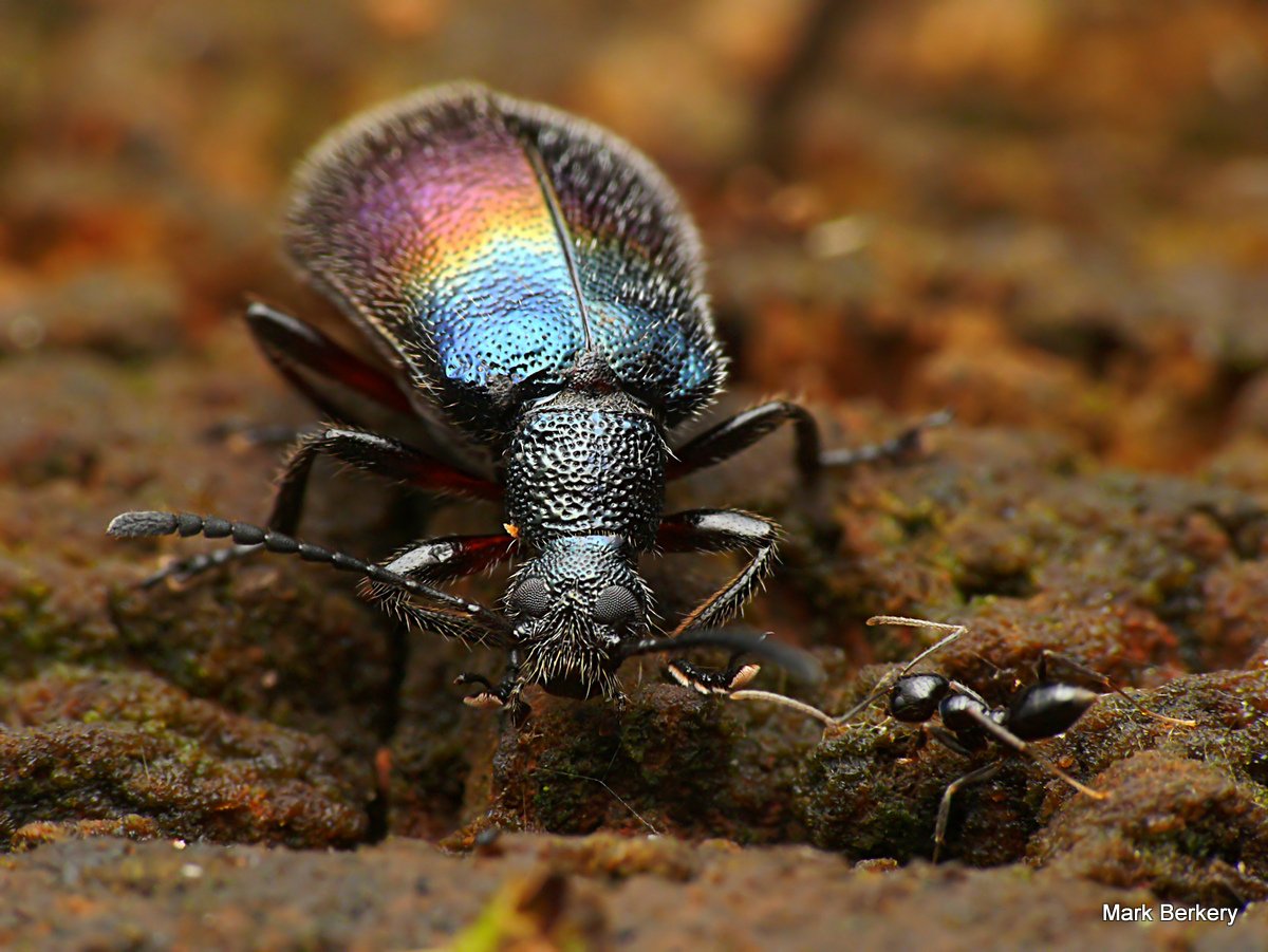 I was in the rainforest and not much was showing up so I put a tiny drop of honey on a rotting wooden post to see what would happen and the beetle, a beautiful darkling in a rainbow coat, showed up. Then the ants showed up and the beetle ran away. It got to the rim of the rotting post and seemed to think twice about running and turned around to go back to the honey. Honey must be total nectar to the small creatures, bees being so protective of it.