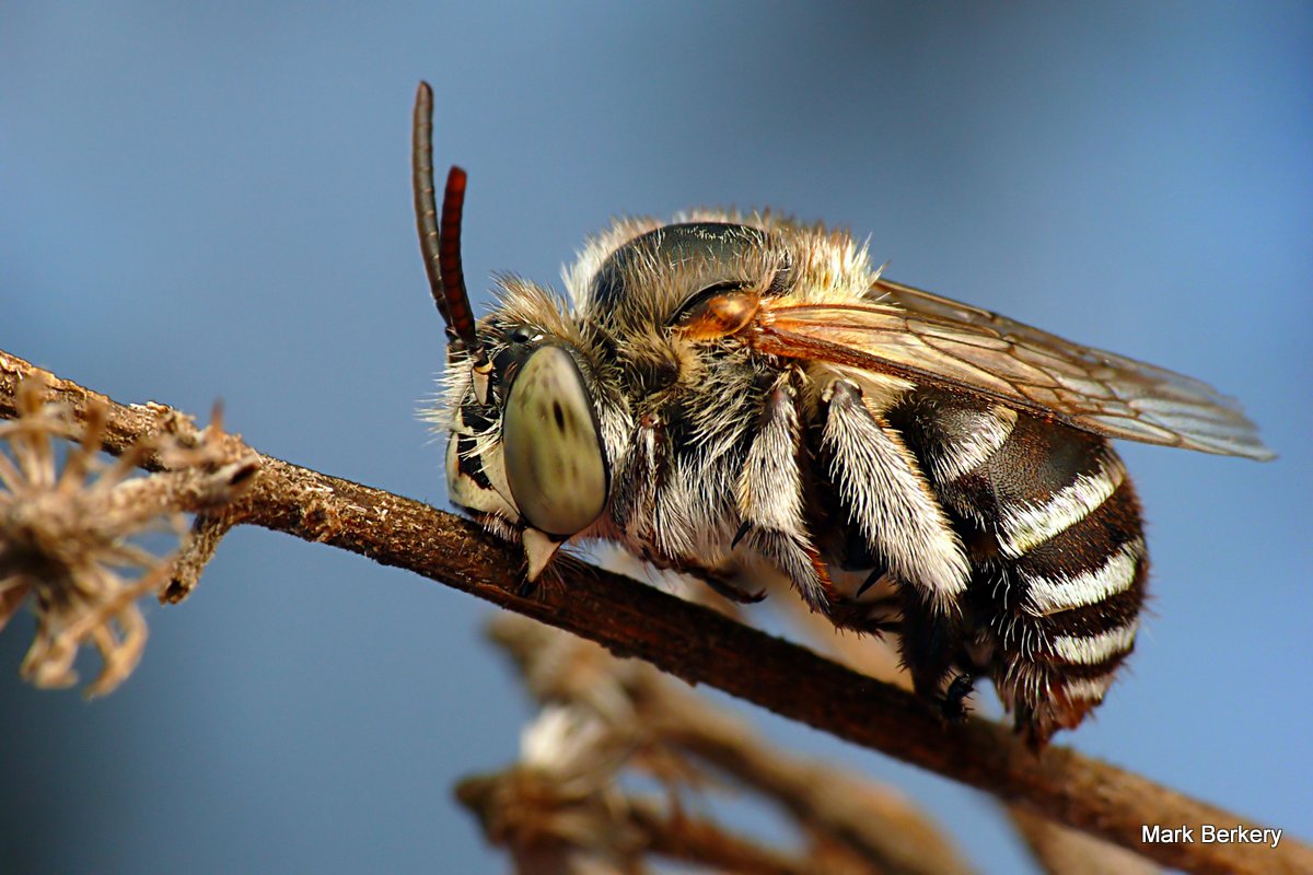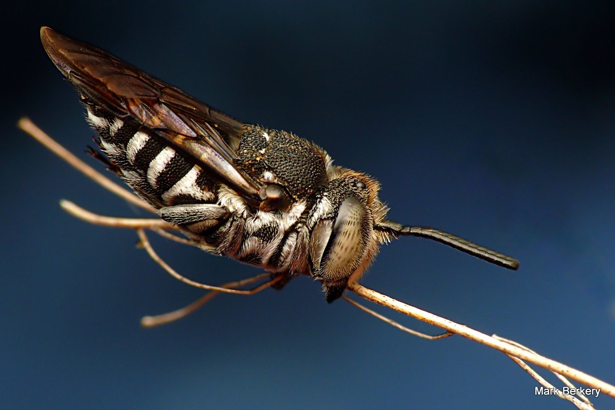 That’s the way they sleep, or rest. This is just on sundown so the bee (Blue Banded, though more grey/silver on this one) is ready to sleep and they do so by locking onto the stem with their mandibles. Same in the first image, it’s a kind of Leaf Cutter and can often be found at dusk in the field of grass with its tail in the air, legs tucked up and gripping the grass stem as in second image. Smaller bees nest/rest inside the stems – like this one : https://beingmark.com/2012/07/19/ hollowing out a narrow cut stem and blowing bubbles.