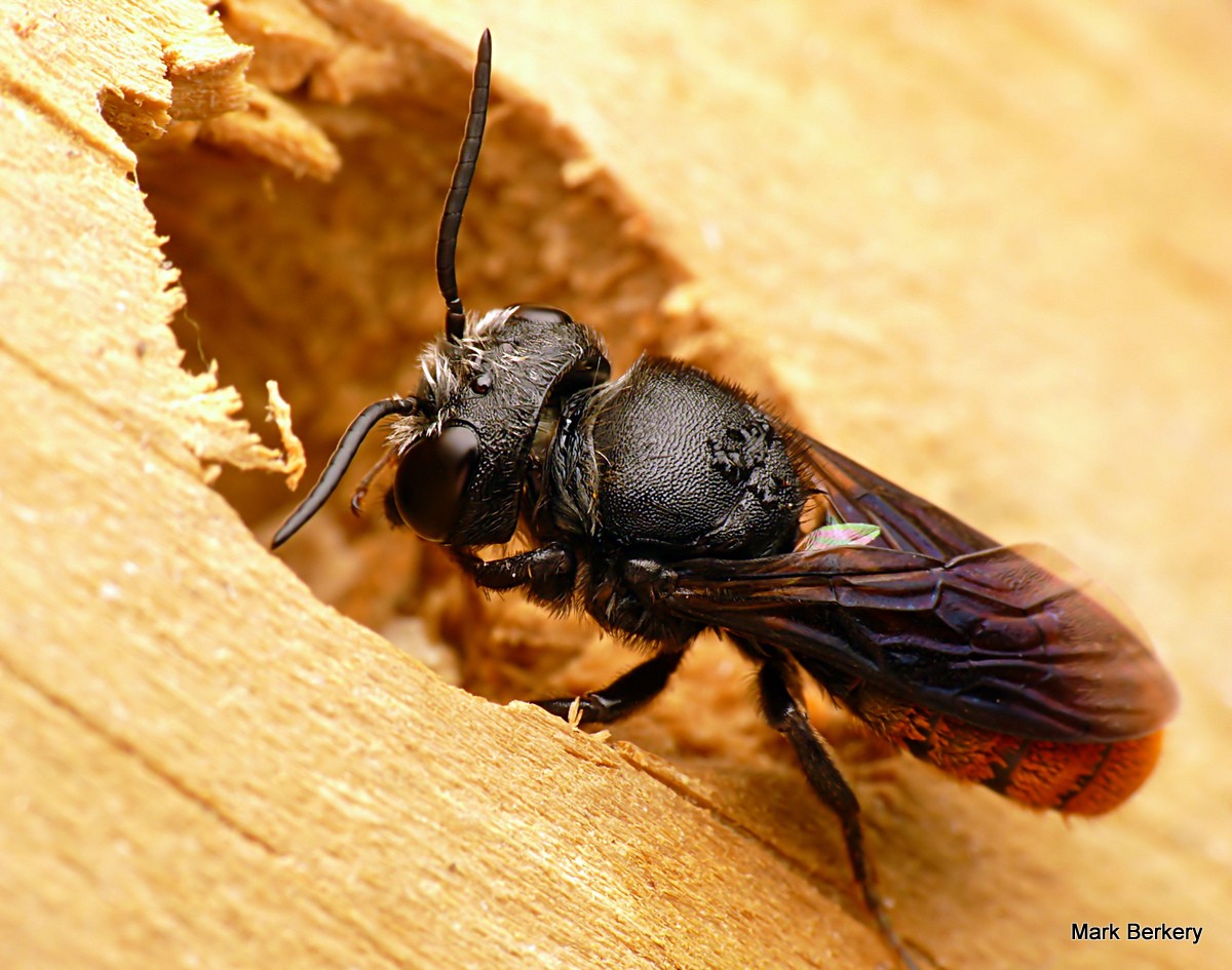 This https://onbeingmark.files.wordpress.com/2012/12/p1060403-mark-berkery.jpg is the smaller one of the three bee hotels hanging under my veranda. The holes are mostly filled with larva and the entrances plugged now, plugged with resin by the Fire Tail Resin bee, bees being born one at a time. Other bees and flying creatures nest here too.
