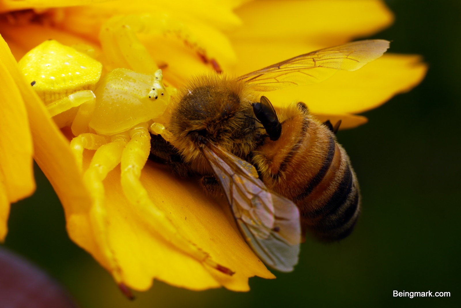 Morning is best time to catch a meal on a flower. An unlucky bee, early to the feast, lucky spider, and green bug snacks.