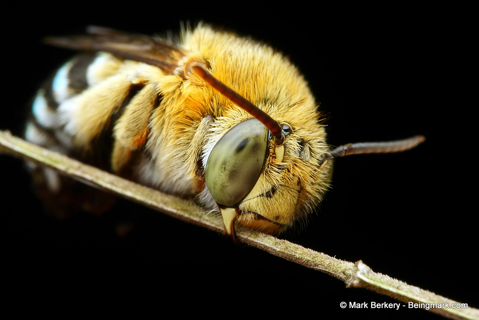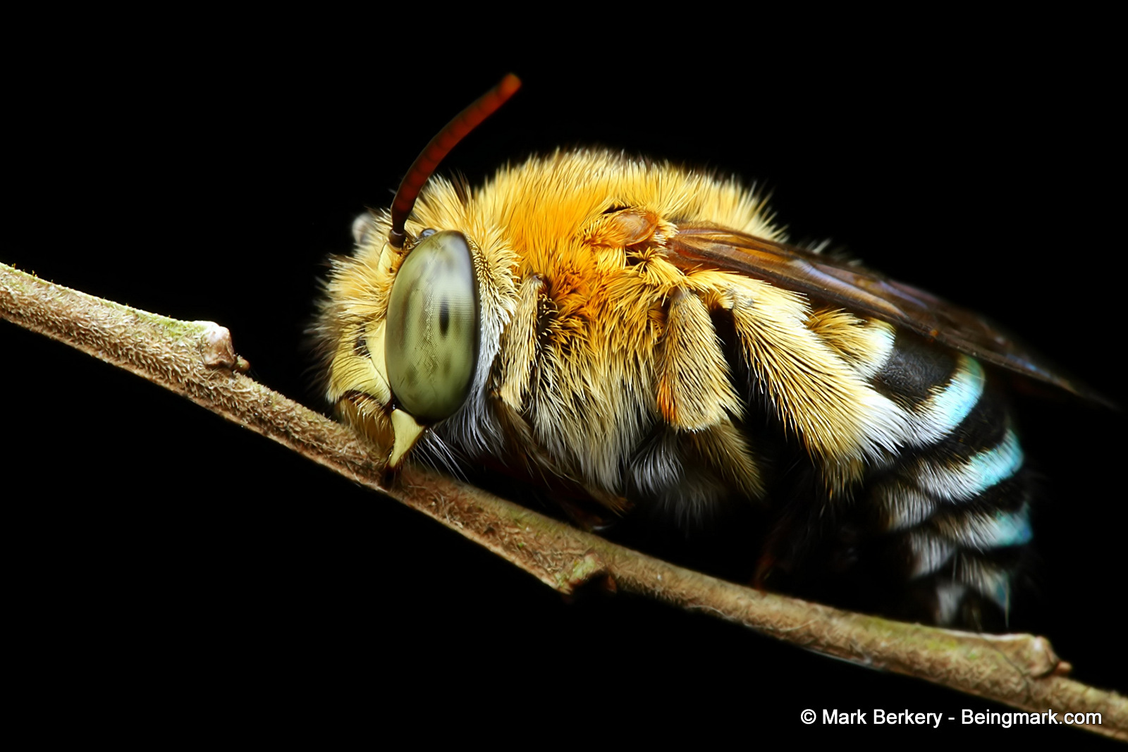 The Blue Banded Bee can be found sheltering from the cold dark sky under cover of the star jasmine, holding on to dried out stems.