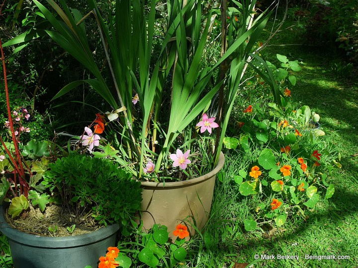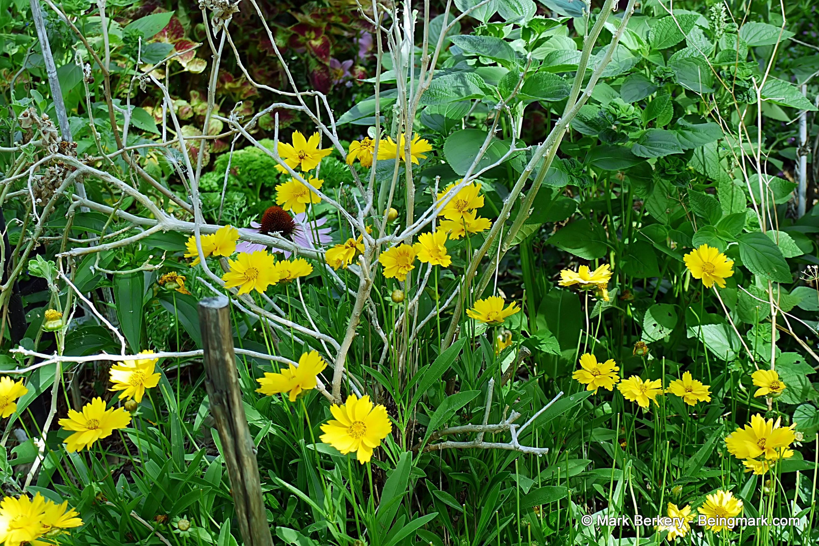 No names either, don’t recall … this yellow flower has been moving around the garden for years, with a lot of help as it needs to be rooted every once in a while. Dead-heading keeps it flowering.
