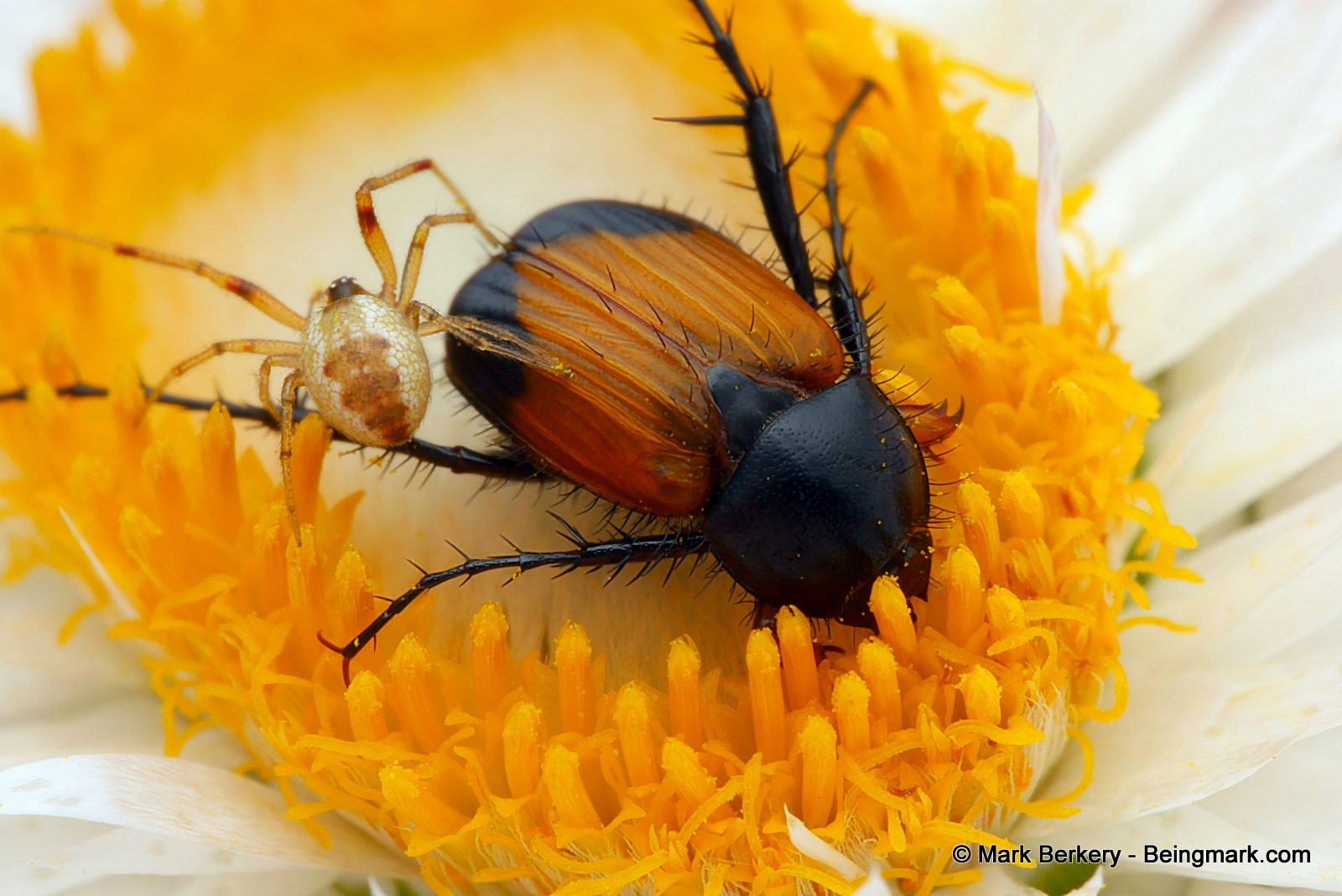 These beetles have a season or two in the garden, depends on the flowering. They like the native ‘crocus’ and various flowering herbs. Here a straw-flower, with a resident spider.