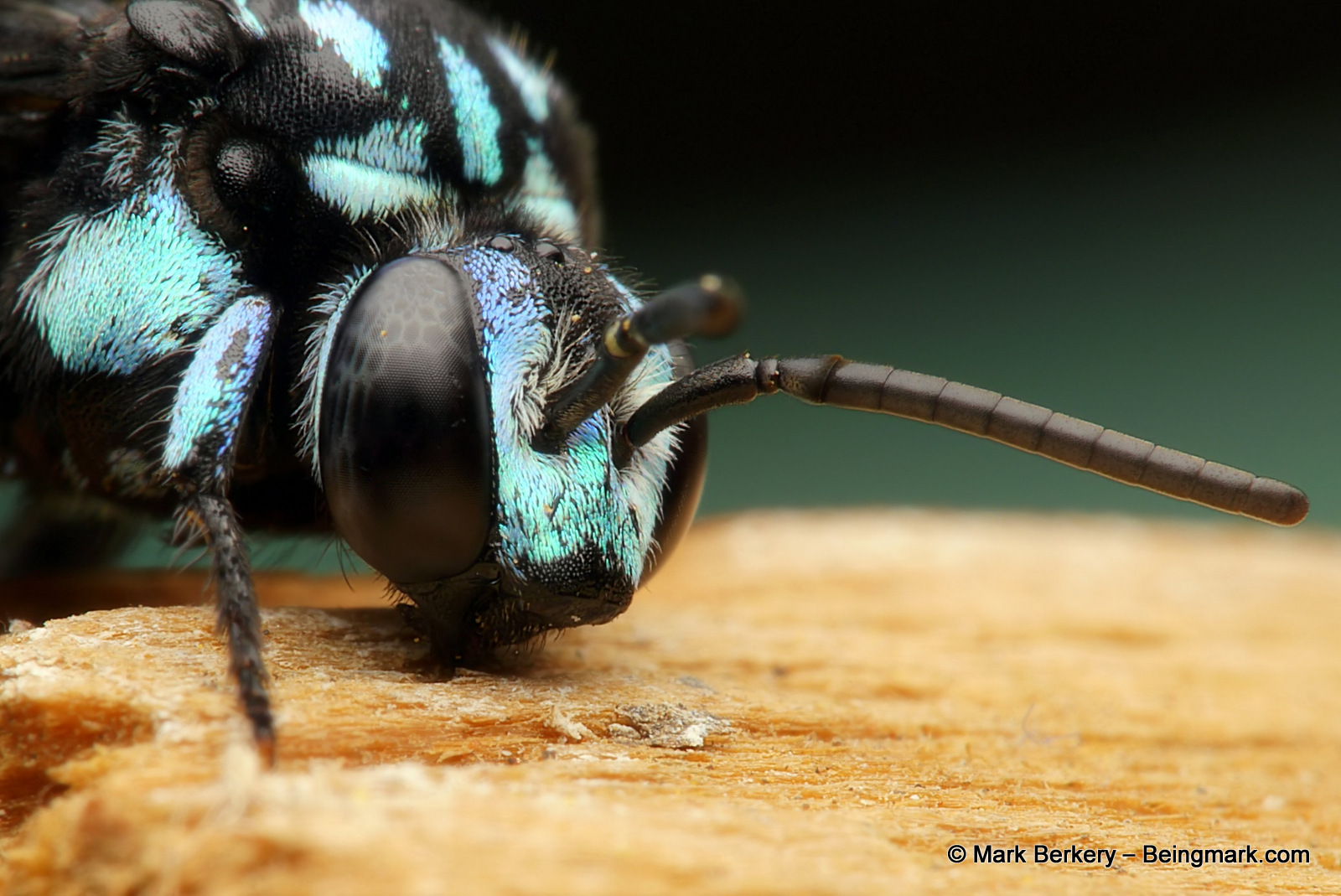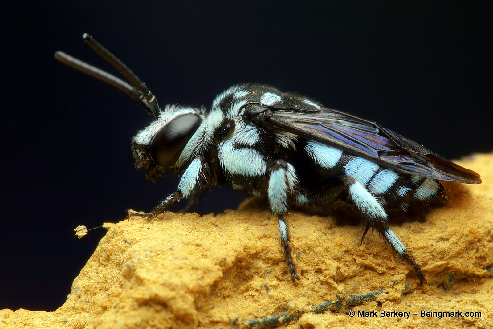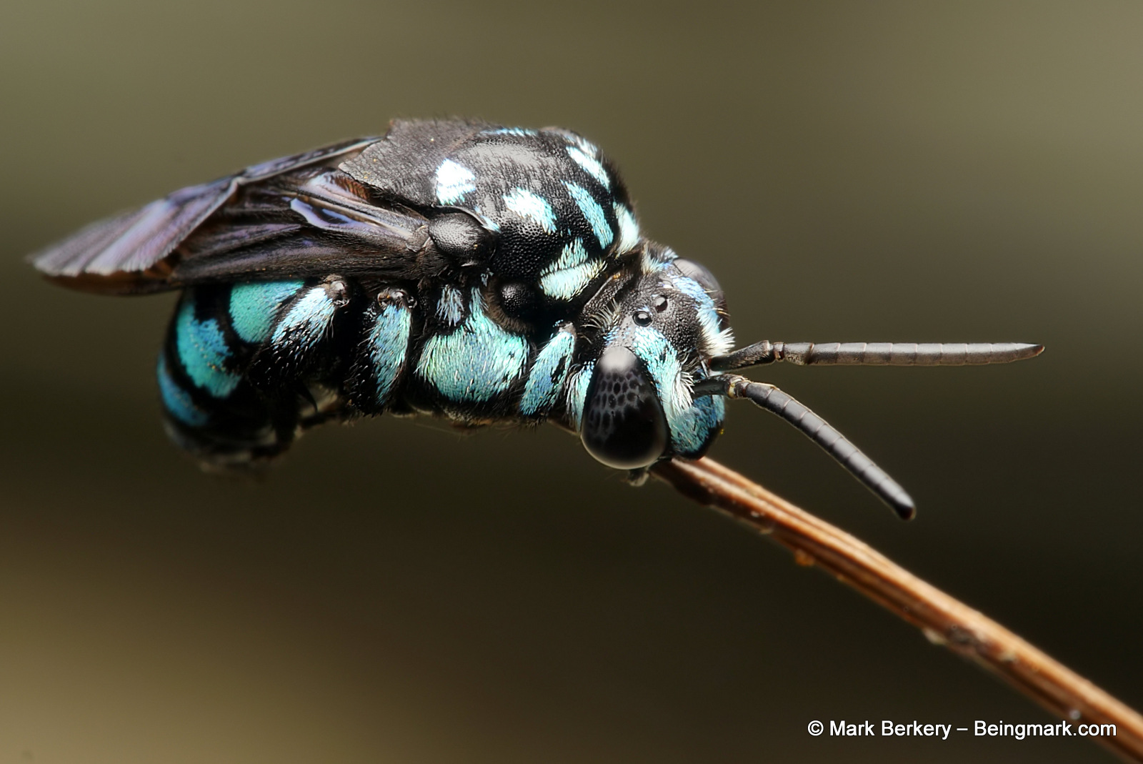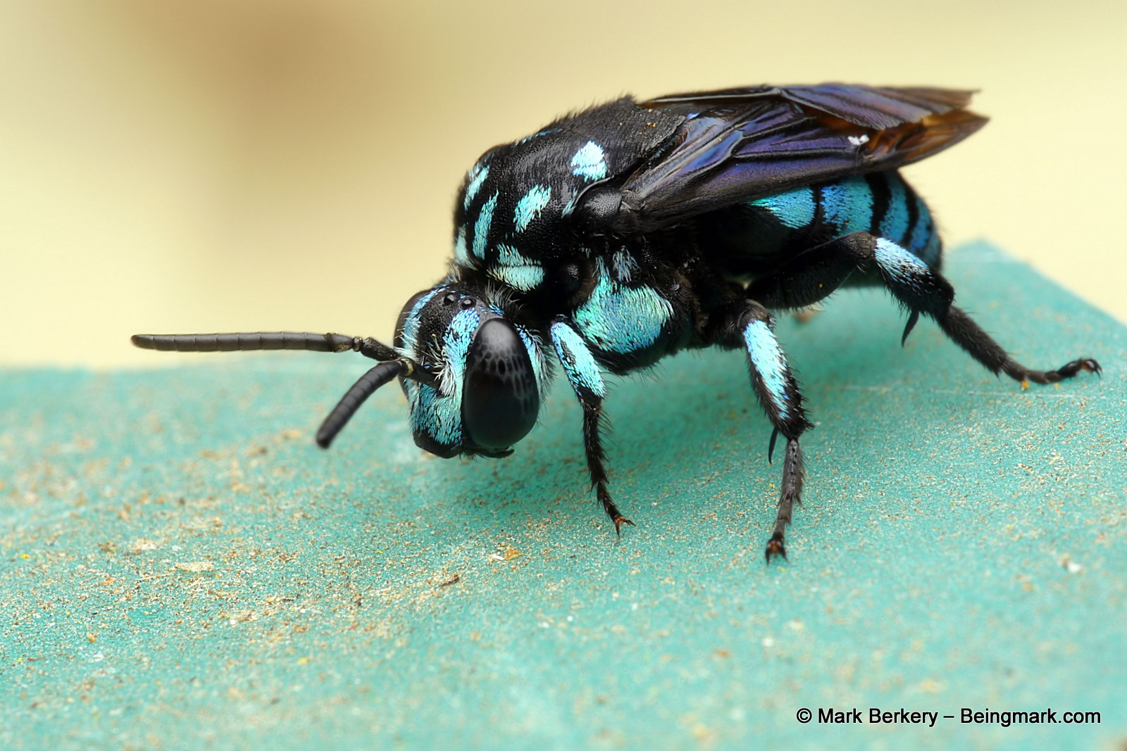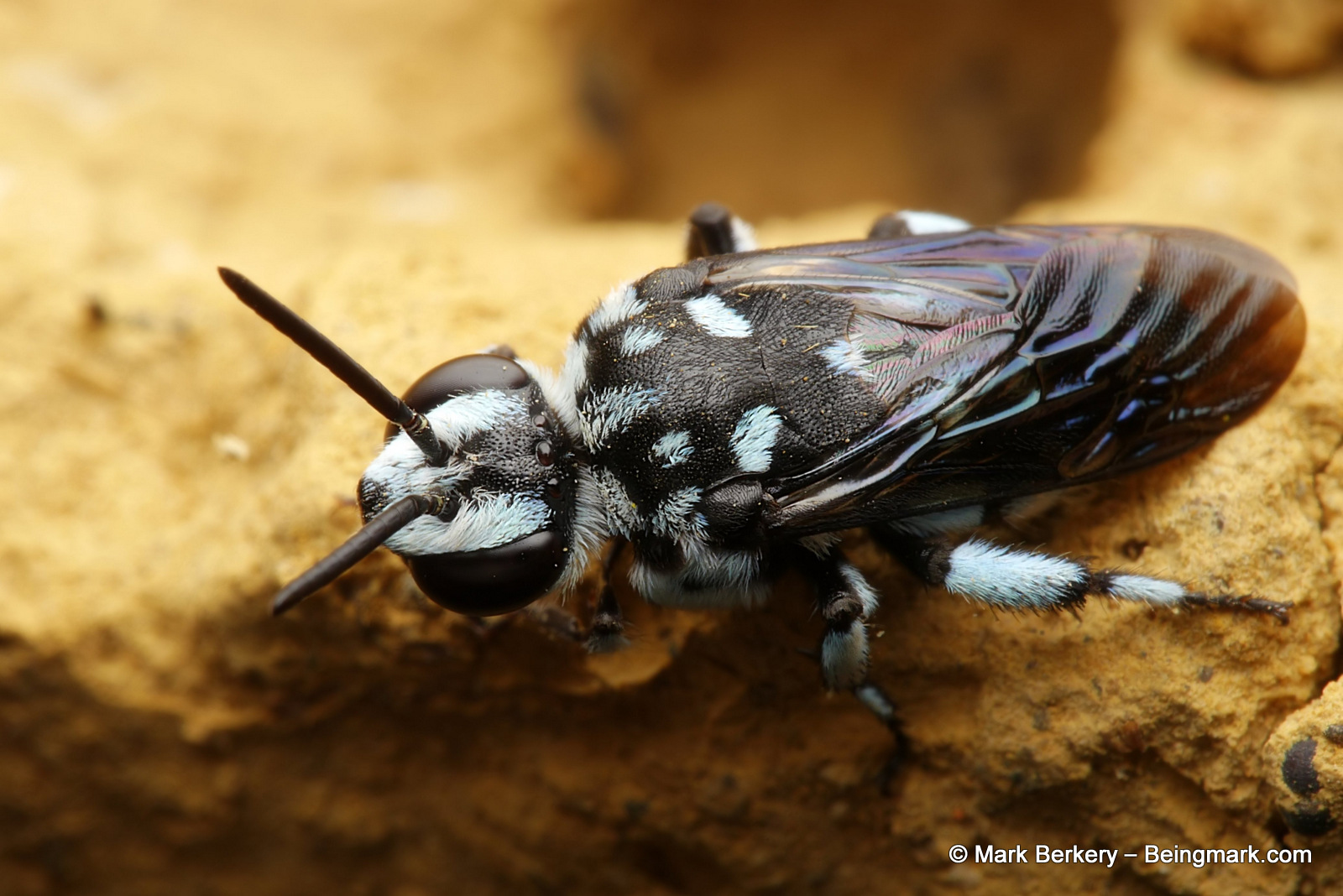 The Neon Cuckoo bee resting from her efforts to populate the Blue Banded Bee’s nests in the big mud brick.