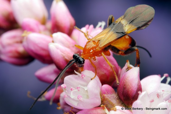 Small wasps, feeding on the pollen and nectar and oblivious of me as I cast my shadow to shade them from the sunlight and get a few shots with controlled flash.