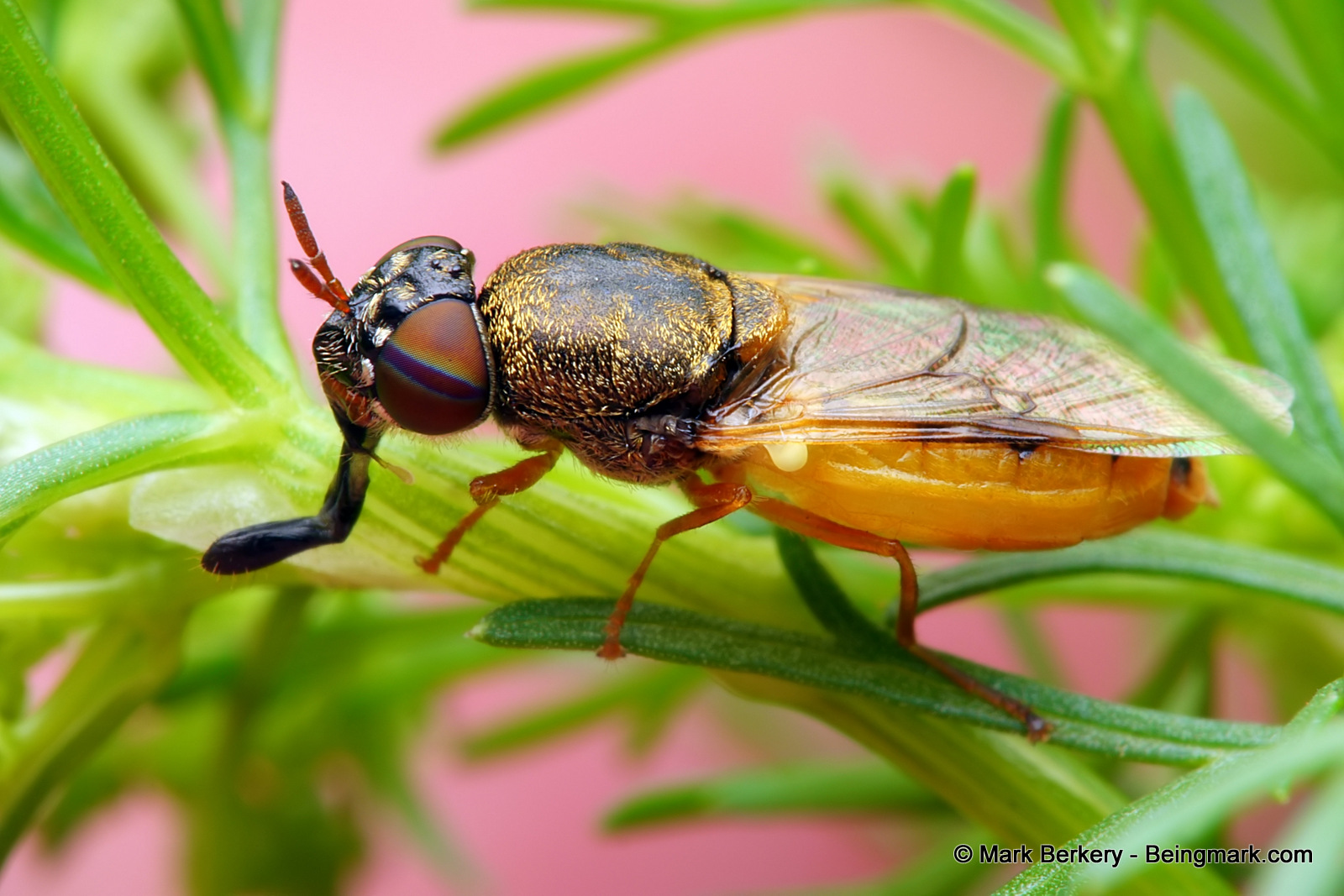 Only found hanging around the blue banded bee nest site, so far. A young fly of another more commonly seen kind, perhaps.