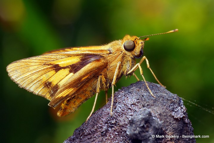 Skipper butterfly sitting on an old lemon still standing after a long winter, gone well past mouldy, and still serving the garden’s mobile inhabitants.