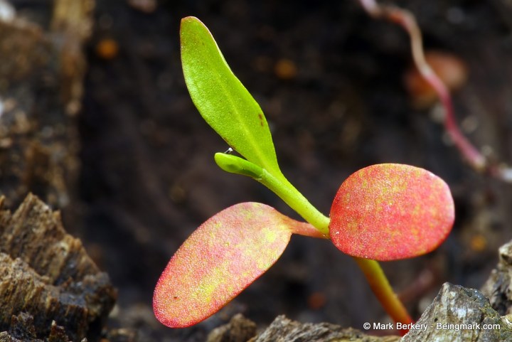 Seedlings shooting up all over the place, will eventually bear flowers and food for the bees that drink hereabouts.