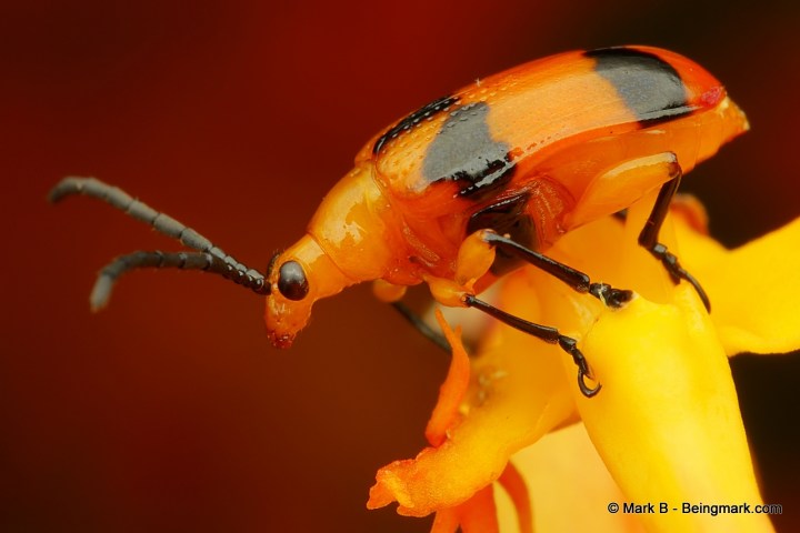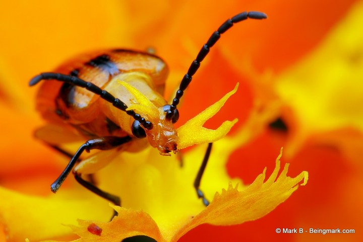 Surrounded in orange, or yellow, and loving it. It’s common to see insects with a piece missing, in this case a clawed foot. Tough world out there.