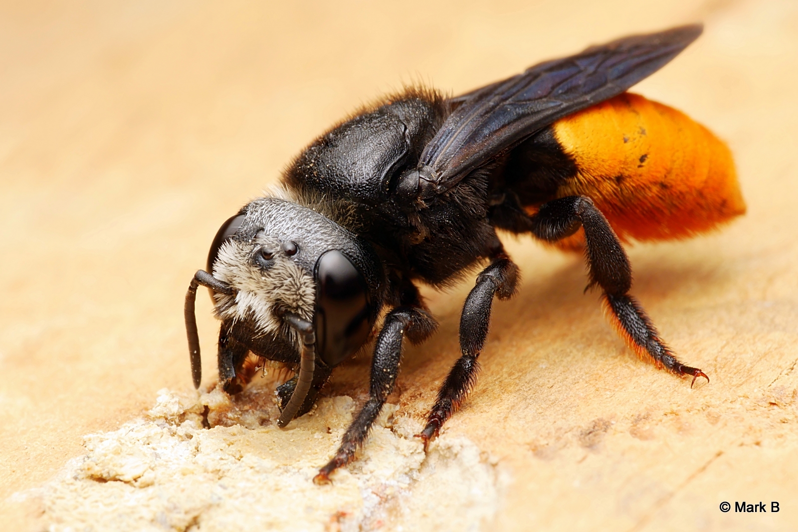 Orange Tail Resin Bee. Finishing off her nest site, sealing in the young of the next generation – protection from predators and parasites.