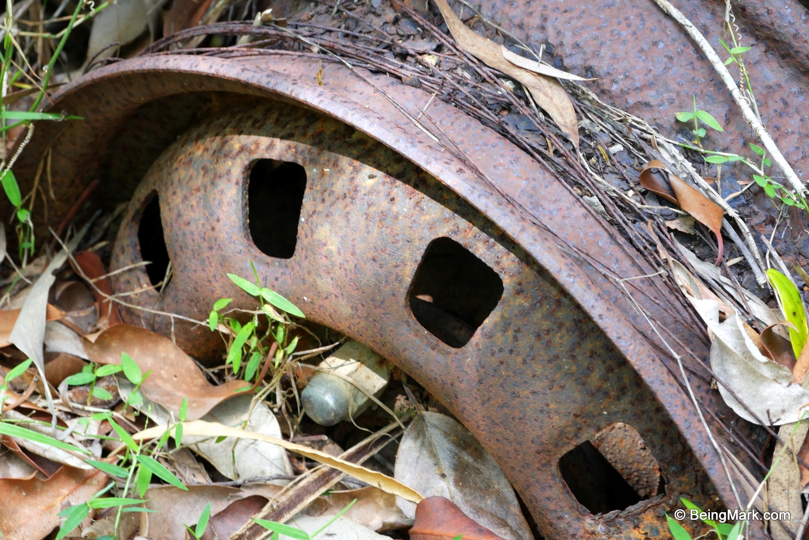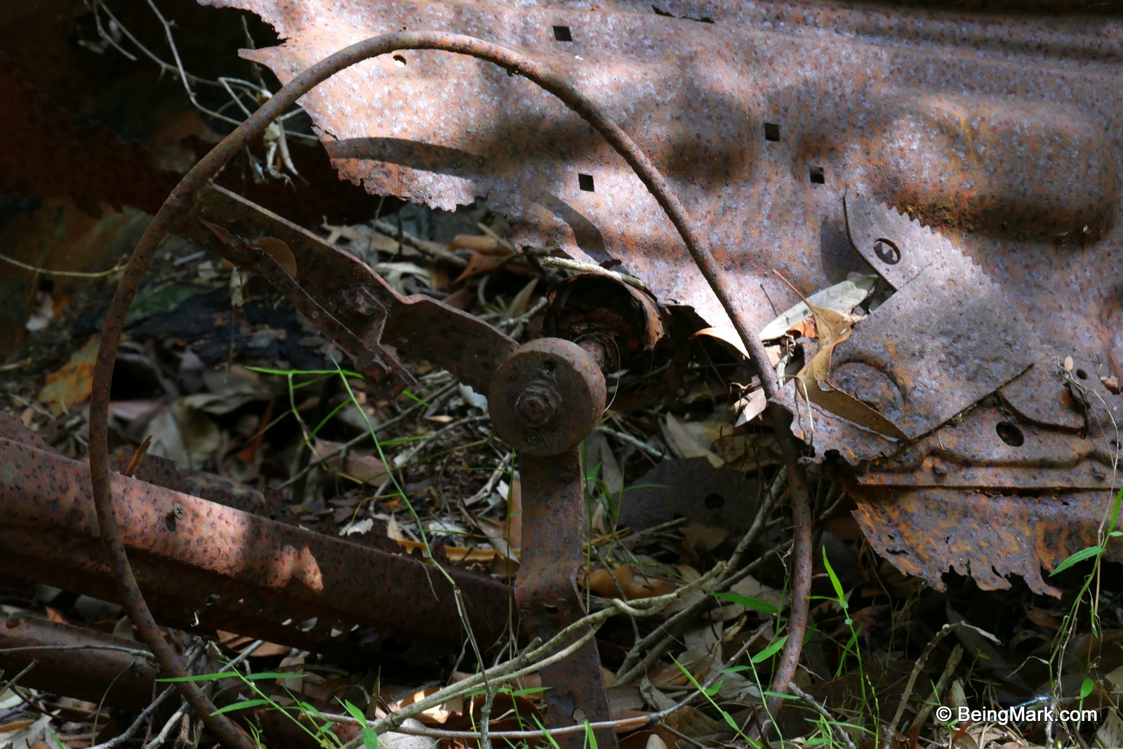 Deeper into the bush, down by a seasonal and therefore dangerous creek, the remains of an old bush basher – its steering wheel by the old rusted out door with the window winding mechanism still more or less intact.