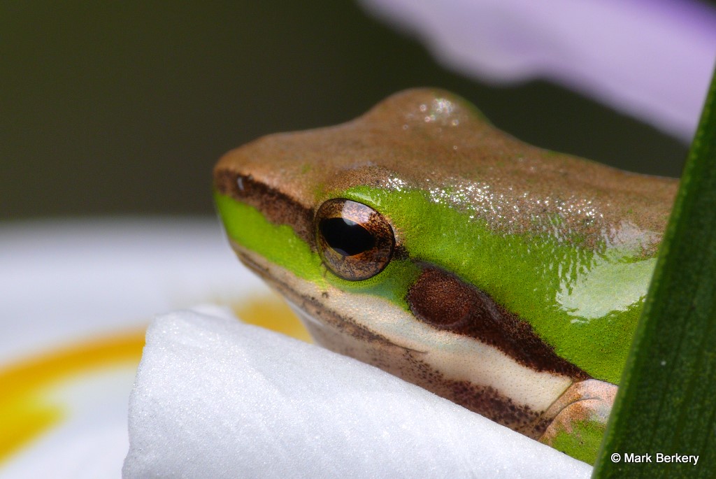 I was looking around for what else may be in the vicinity and there was one of the little brown frogs from early spring, only now it was turning green though not much bigger. It was also in position to catch some black bees, up on the leaf about the flower, but after a few shots it jumped away down the plant.