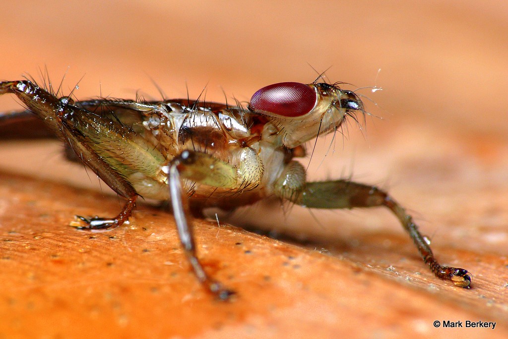 It doesn’t stand up like other flies, it squats close and creeps sideways and all ways. Nor does it have a back body section of any size. It would be about one cm long, black and glossy to the eye.