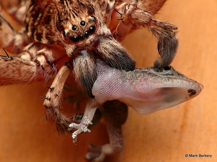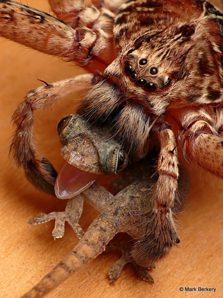 The blink of an eye and it was almost over for the Gecko. The Huntsman was taking no chance of losing its catch, holding on tight and then biting closer to the head before silently slinking away with its meal, glistening venom cascading over one of its prey’s eyes.