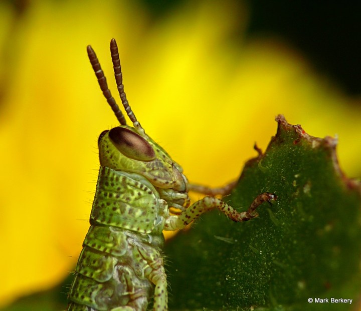 Grasshopper eyeing up the Marigold. They eat the flowers with a hearty appetite, must be the delicate beauty they are imbibing.