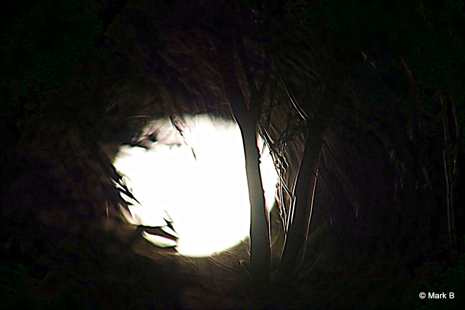 An unexpected visitor. Owl, I’m fairly sure. An uncommon for me night time shot, by torchlight – I’m not equipped for distance night work. She didn’t see me behind the light.