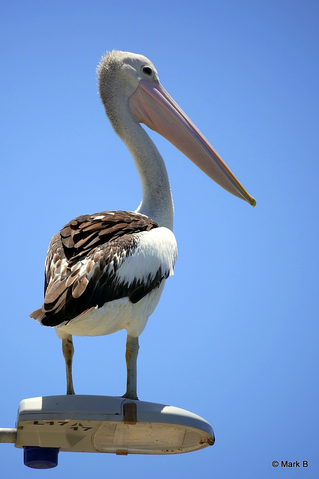 Down by the island ferry terminal to Coochiemudlo, these pelicans do show up and roost on top of very tall lamp posts and power poles.