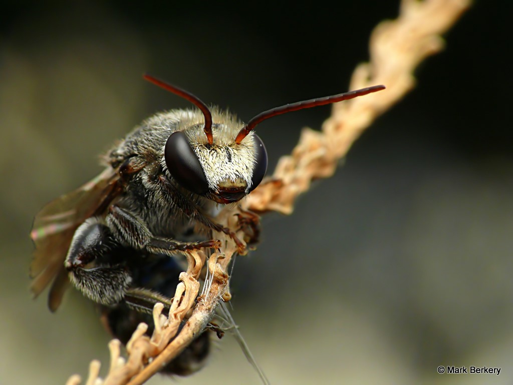 A nomad bee from a nearby field at sundown on a cloudy afternoon.