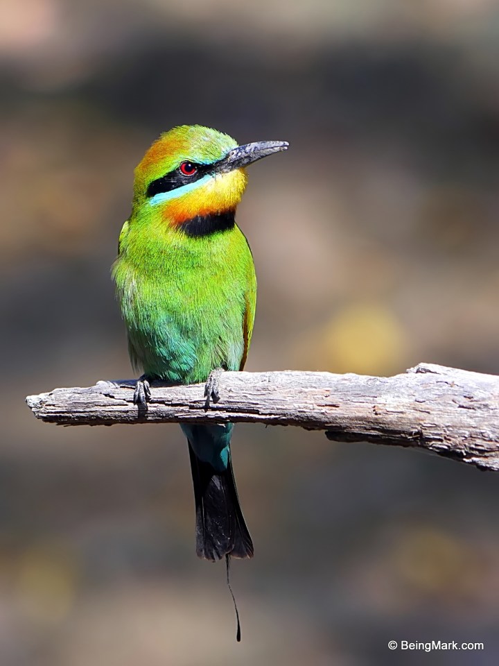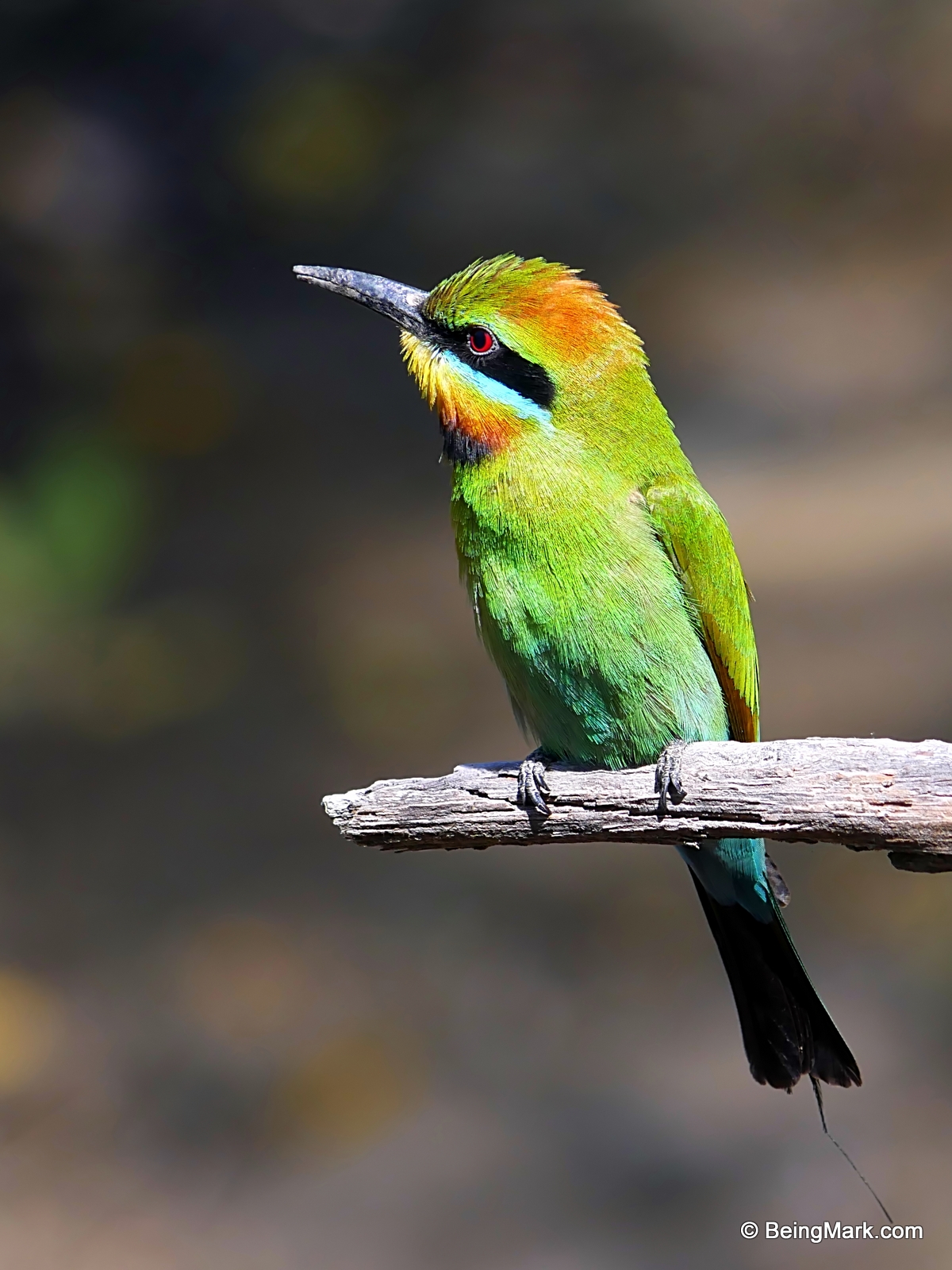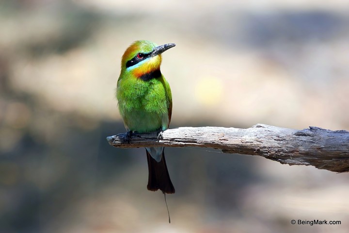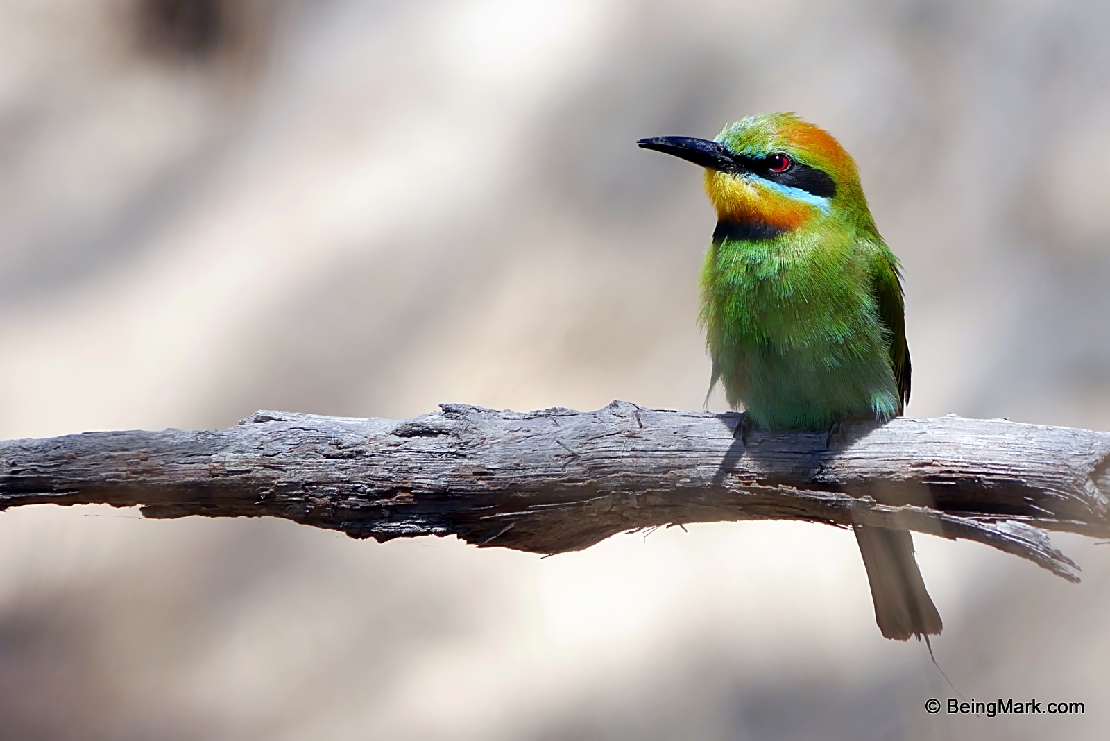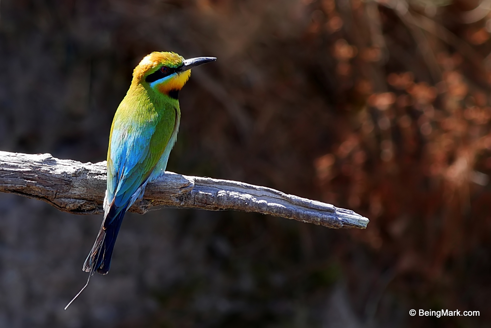 As luck would have it, one or two have been sitting within range the last week or so. Range enough … Rainbow Bee Eaters, I believe, nesting in the creek bank wall on the sunny side.